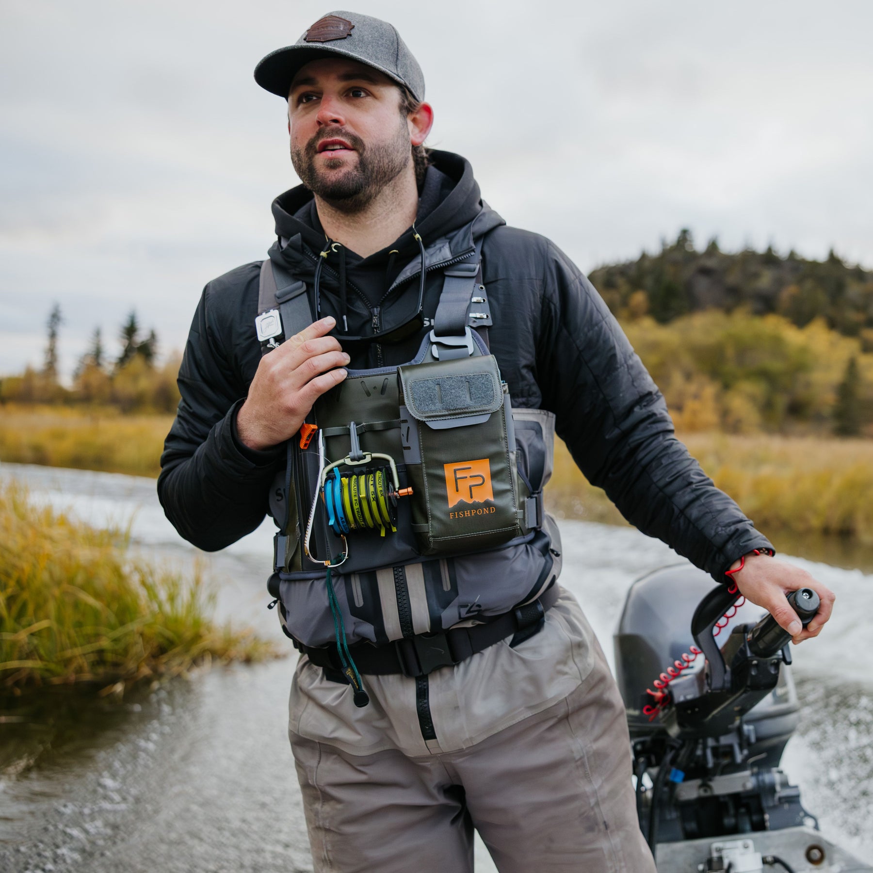 During a lifetime on the water, one of the many lessons learned is that the more you know, the less you need. However, when it comes to a minimalist setup, size often comes with a trade-off in functionality. Enter the water-resistant Stormshadow Chest Pack, the culmination of years of fine-tuning to design a carry system for the angler who knows exactly what they need and where their adventures will take them. The quick-access front pocket with magnetic closure allows you to keep multiple fly boxes on hand. Terminal tackle and other essentials find a home in the exterior stretch pocket, inside a hidden zippered pocket on the interior of the front panel, or on a multitude of exterior attachment points. An integrated waterproof pocket featuring a TRU Zip self-healing zipper guards your valuables against submersion, allowing you to explore with confidence. Designed to conform to the body and evenly distribute weight, this pack offers effortless movement in the water or on a boat. For guides and anglers who carry a larger net, the posterior net slot keeps even the longest-handled nets out of the way. If you’re looking to add capacity to your setup, the included attachment straps allow you to seamlessly integrate the front panel of the chest pack onto your existing Fishpond backpack. Embrace simplicity without compromise.