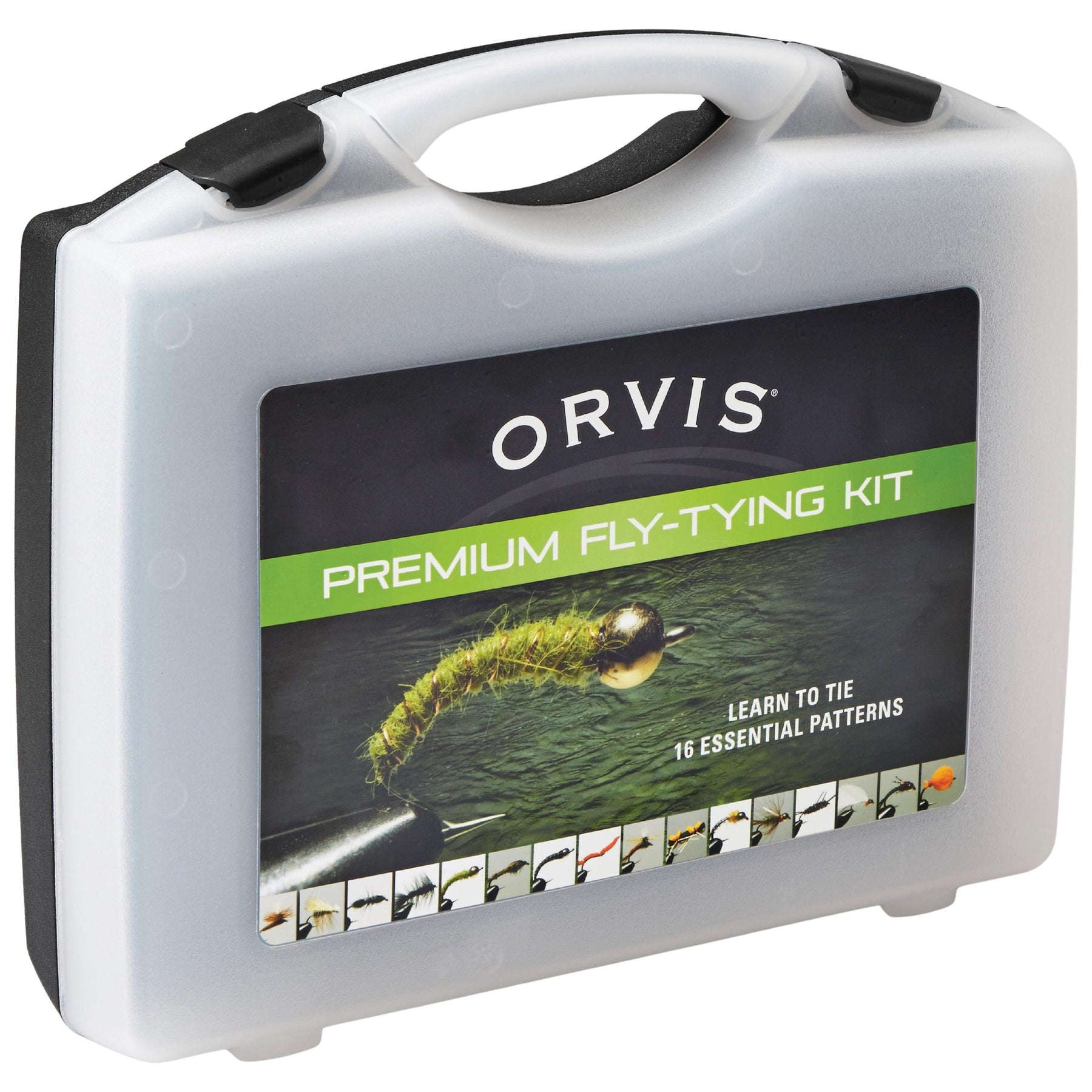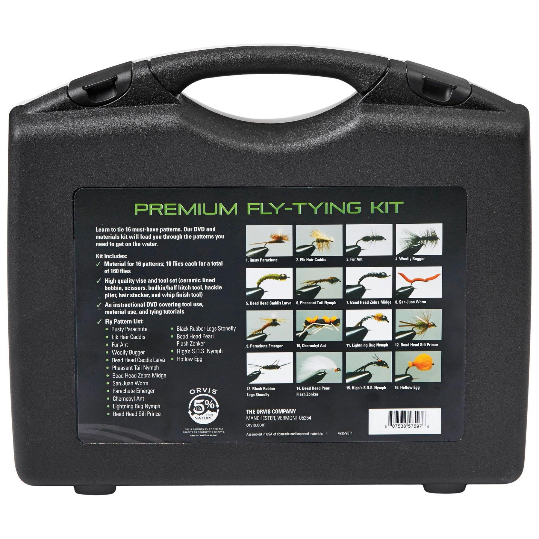 Learn to tie the classics with this comprehensive Orvis Premium Fly-Tying Kit. Materials for 16 patterns, 10 flies each, for a total of 160 flies. 8 basic patterns and 8 guide-proven premium patterns. Comes with instructional DVD with tutorials for every pattern made expressly for the kit, and it also goes over basic tool instructions. Plus, it was made by Tim Flagler of Tightline Productions, considered by most to be the best fly-tying videographer around. High-quality vise and tool set (includes ceramic lined bobbin, scissors, bodkin, half-hitch tool, hackle plier, hairstacker, and whip finish tool. Durable and convenient carrying case.